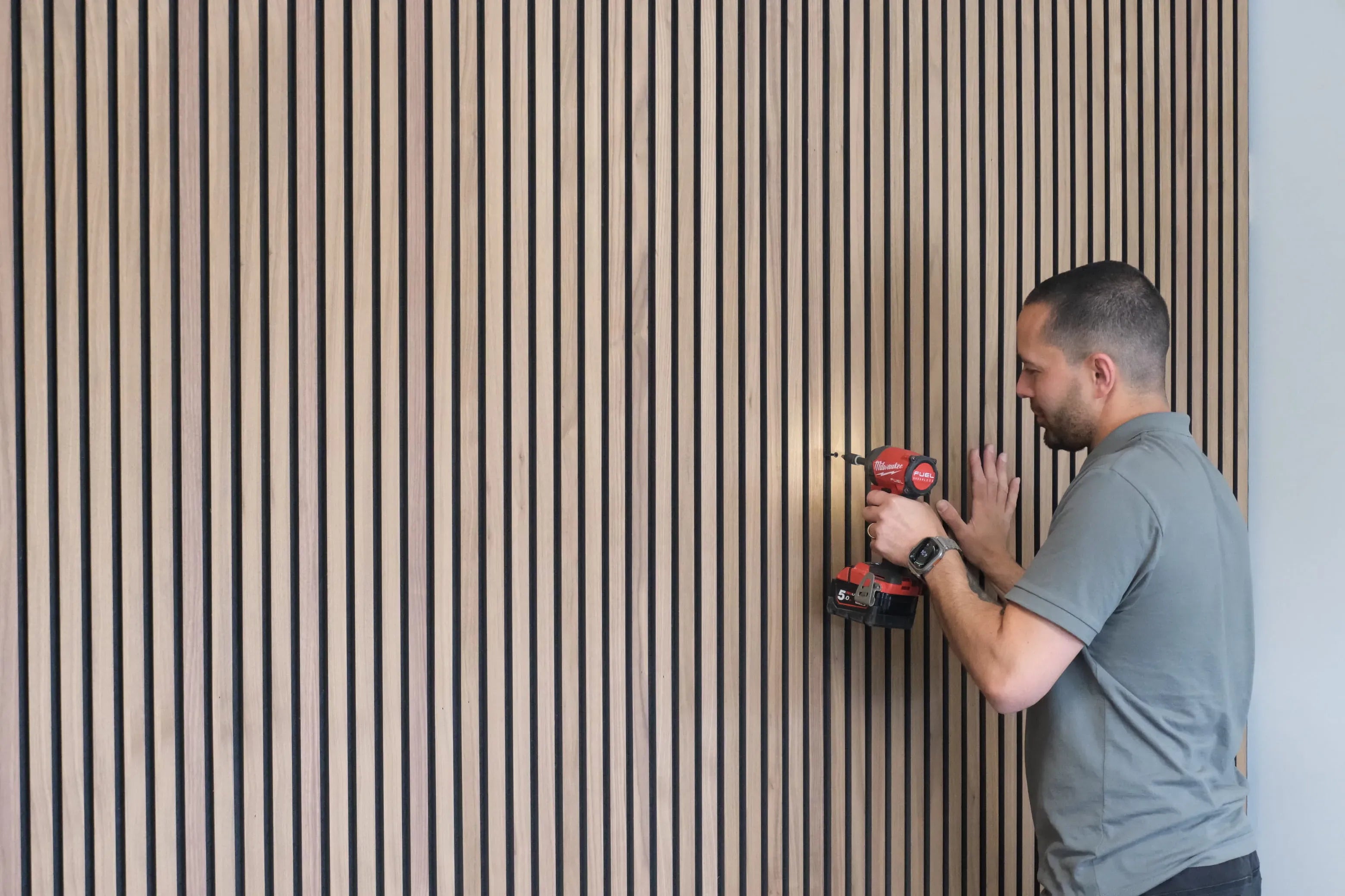 Secure panels by screwing through the felt backing between the slats and into the drywall. Use four screws per side, evenly spaced to keep fixings discreet. Matte black screws blend into the felt for a clean finish.