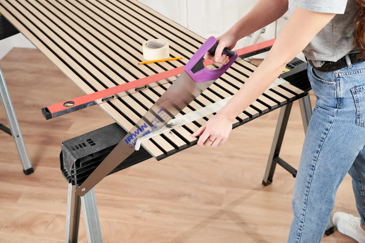For the cleanest result, we recommend using a fine-toothed saw blade. This applies whether you’re using a hand saw or a power saw such as a circular saw or track saw. A track saw will give the straightest cuts if you have access to one, but it’s not essential.