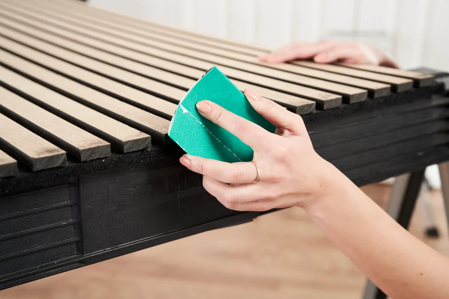 Lightly sand the cut edges until smooth. This step helps refine the finish and ensures the panel looks clean and intentional once installed.