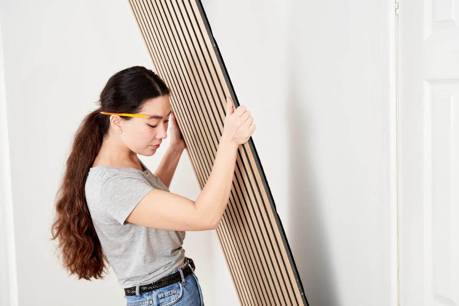 Secure the panel by screwing through the felt backing between the slats and into the drywall. We recommend four screws per side, spaced evenly from top to bottom to keep fixings discreet. Matte black screws blend into the felt for a clean, minimal look.