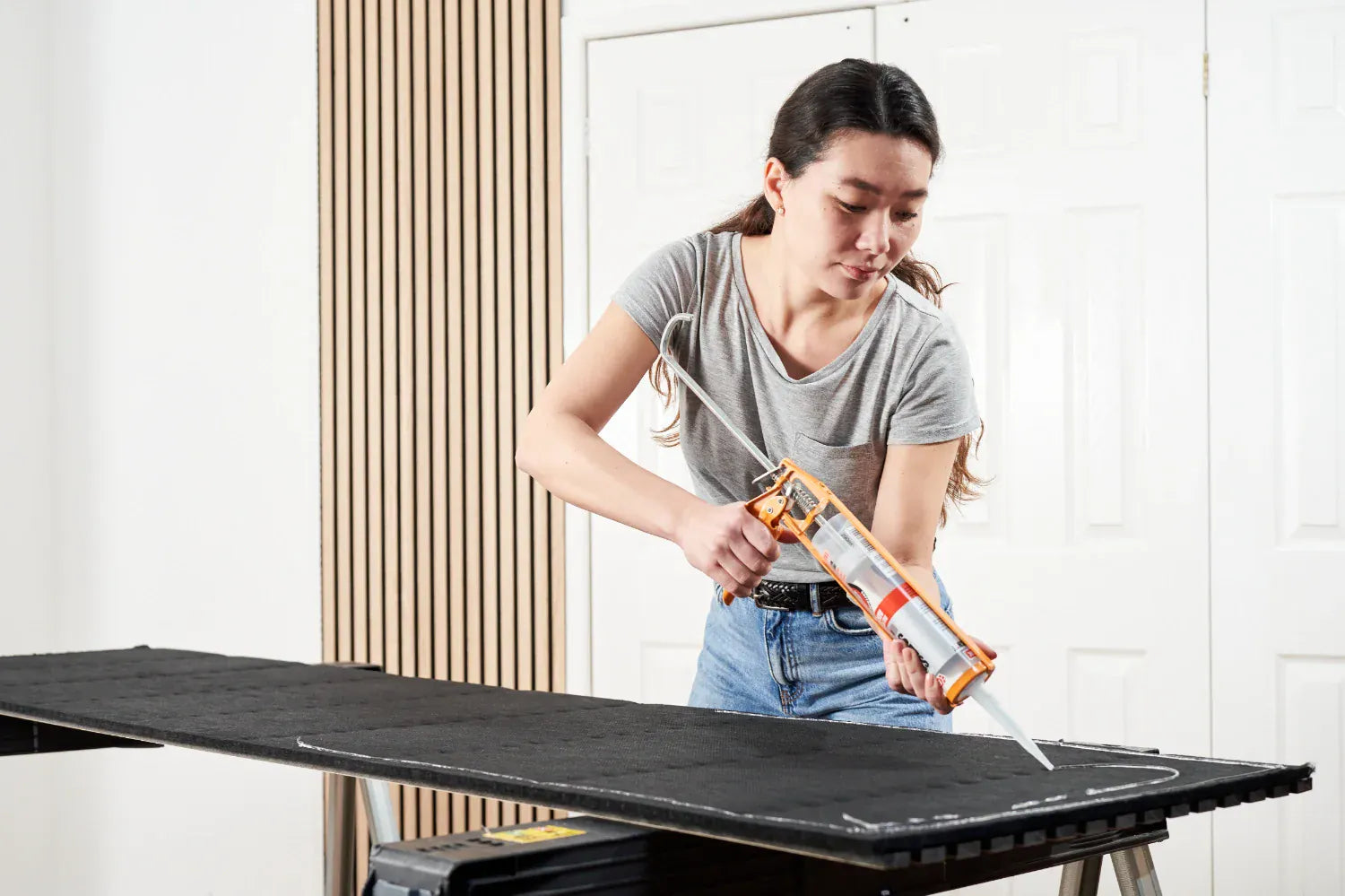 or a more permanent install, panels can be fixed using WVH panel adhesive. Apply a bead around the edge of the panel, keeping it slightly in from the edge, then run a zigzag pattern down the centre before pressing the panel firmly onto the wall.
